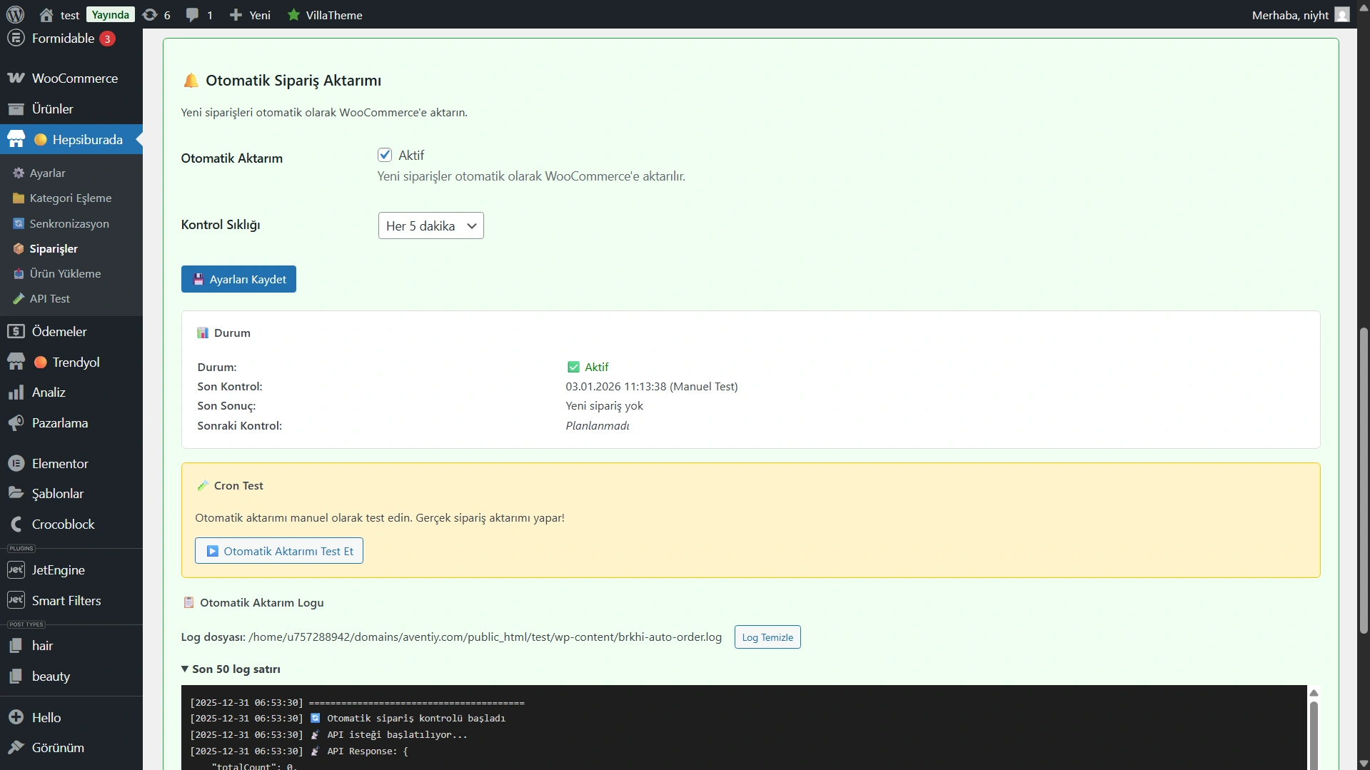 Hepsiburada’dan gelen siparişler, tüm detaylarıyla (Müşteri notu, kargo bilgisi vb.) WooCommerce “Siparişler” ekranına otomatik düşer.